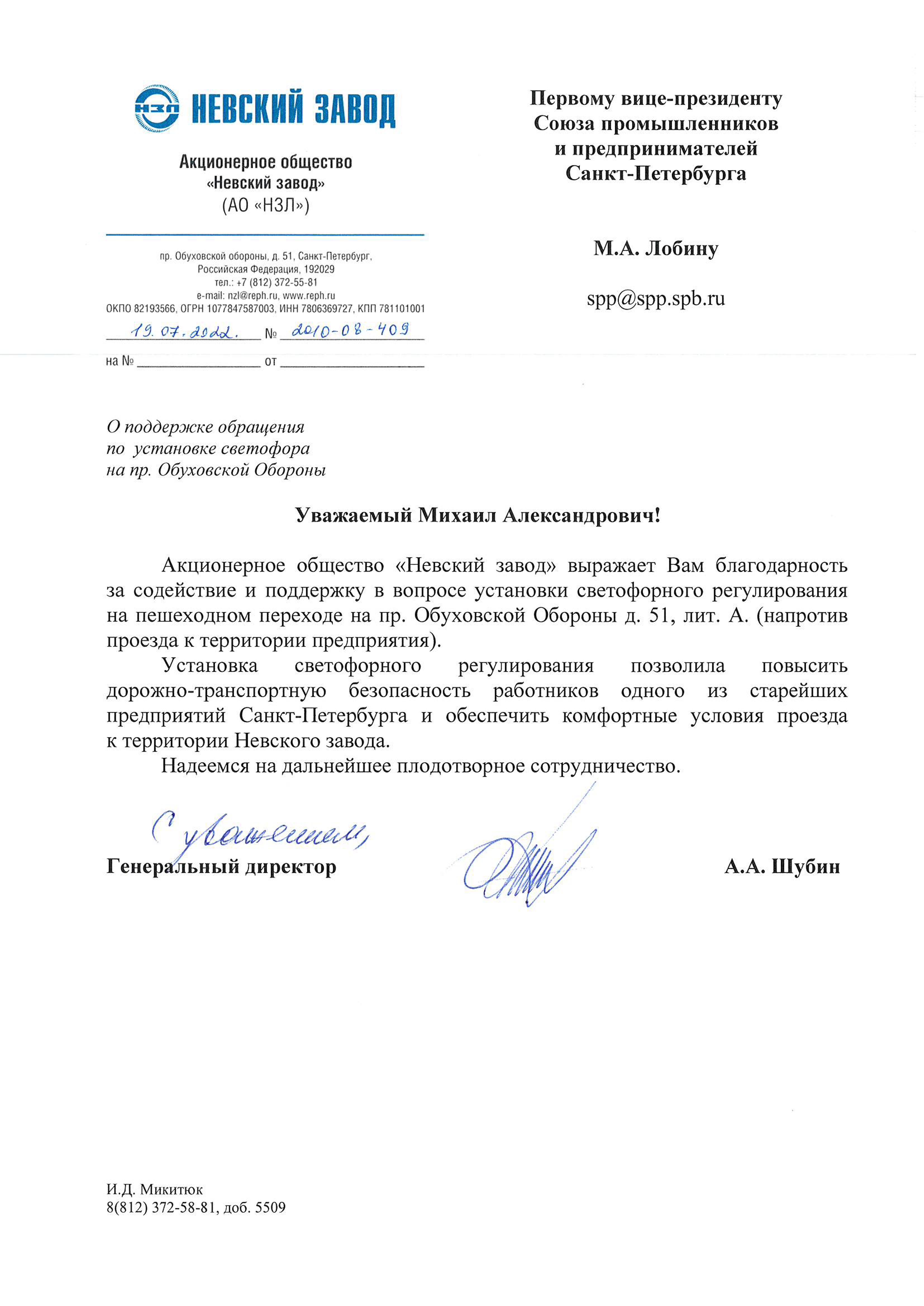 Акционерное общество «Невский завод» выразили благодарность СПП СПб за содействие по вопросу установки светофора